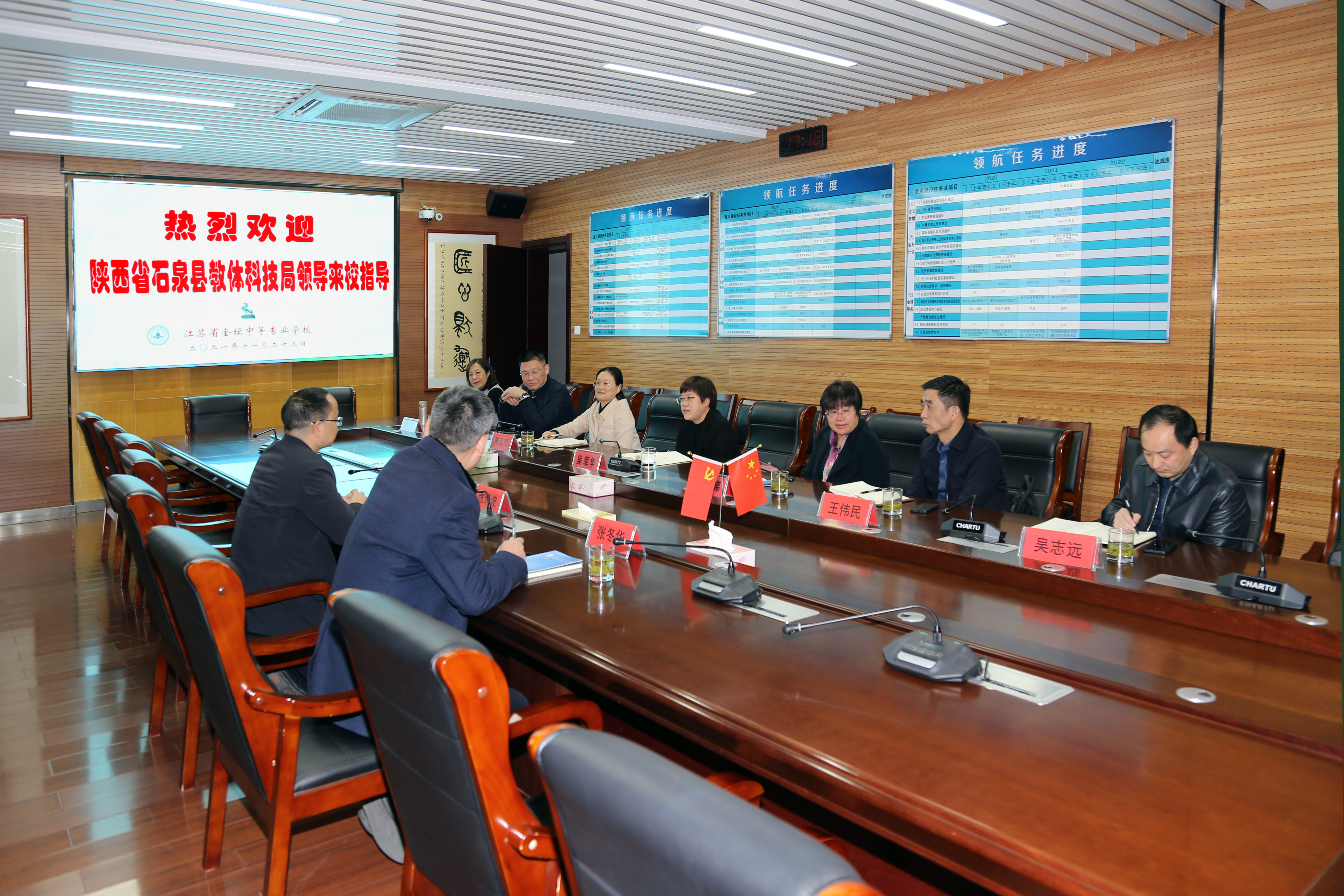 为扎实推进苏陕协作发展,进一步落实区政府结对帮扶政策,共享两地教育资源,推动两地教育事业跨越式发展,2021年11月23日下午,石泉县教体科技局党委书记、局长张诗波,石泉县职教中心校长张冬华,在区教育局吴军华局长、张五芳副局长、陈金娣副局长等人的陪同下到我校参观考察与交流,学校卞勇平校长、林静书记等全程陪同考察交流。