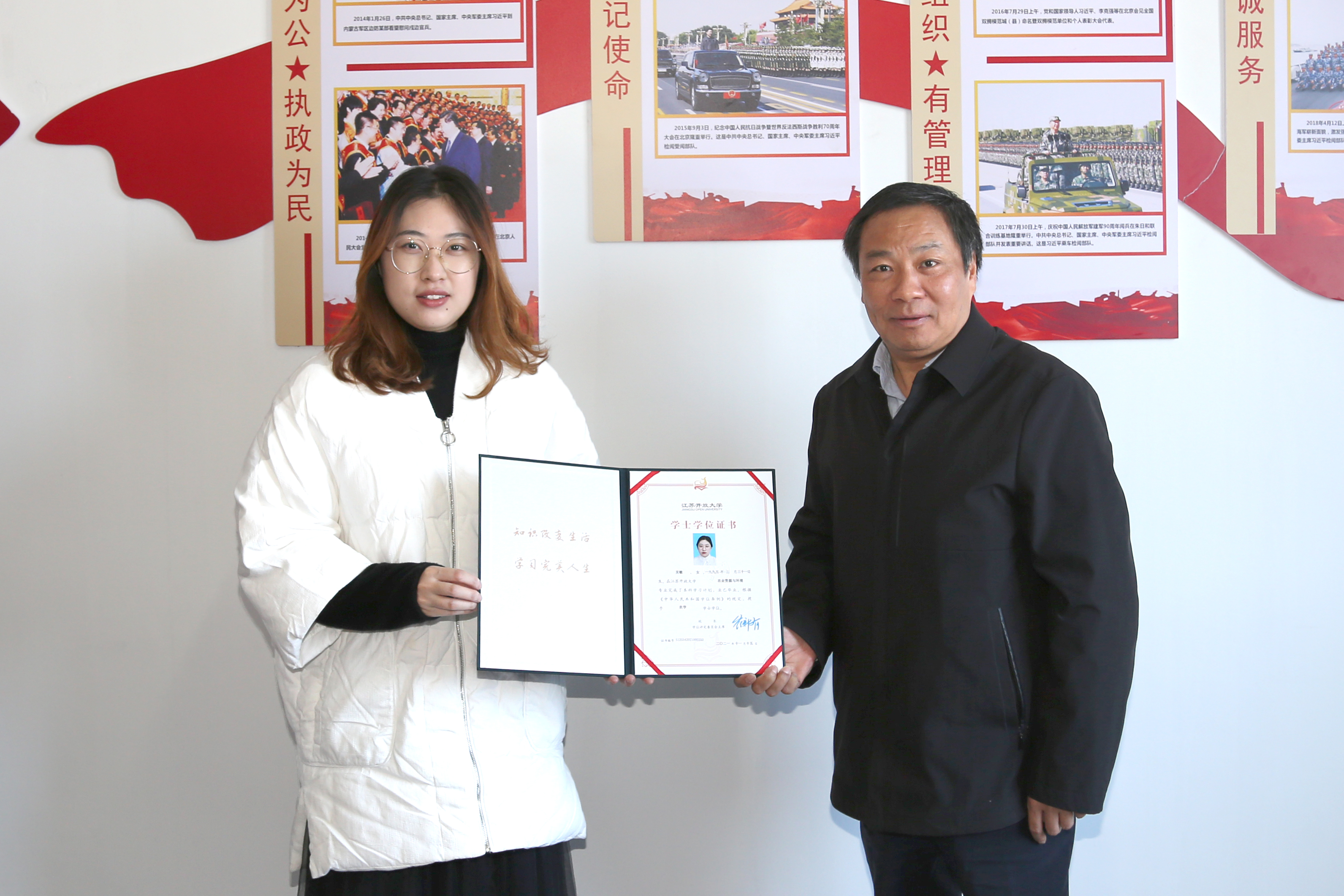 26日上午,在金坛开放大学王理华副校长的陪同下,张晓副校长一行首先走访了2021届优秀毕业生吴敏。吴敏是金城镇长竹埂村委会的一名村干部,为了更好地解决农村基层工作中的难题,当好老百姓的“贴心人”,市场营销专业毕业的她毅然报读江苏开放大学农业资源与环境本科专业,并以优异的成绩获得学士学位。江苏开放大学教务处处长钱琦现场为吴敏颁发学位证书,并赠予她乡村振兴项目线上课程。张晓副校长对吴敏表示祝贺,勉励她运用所学知识更好地服务百姓、报效家乡。