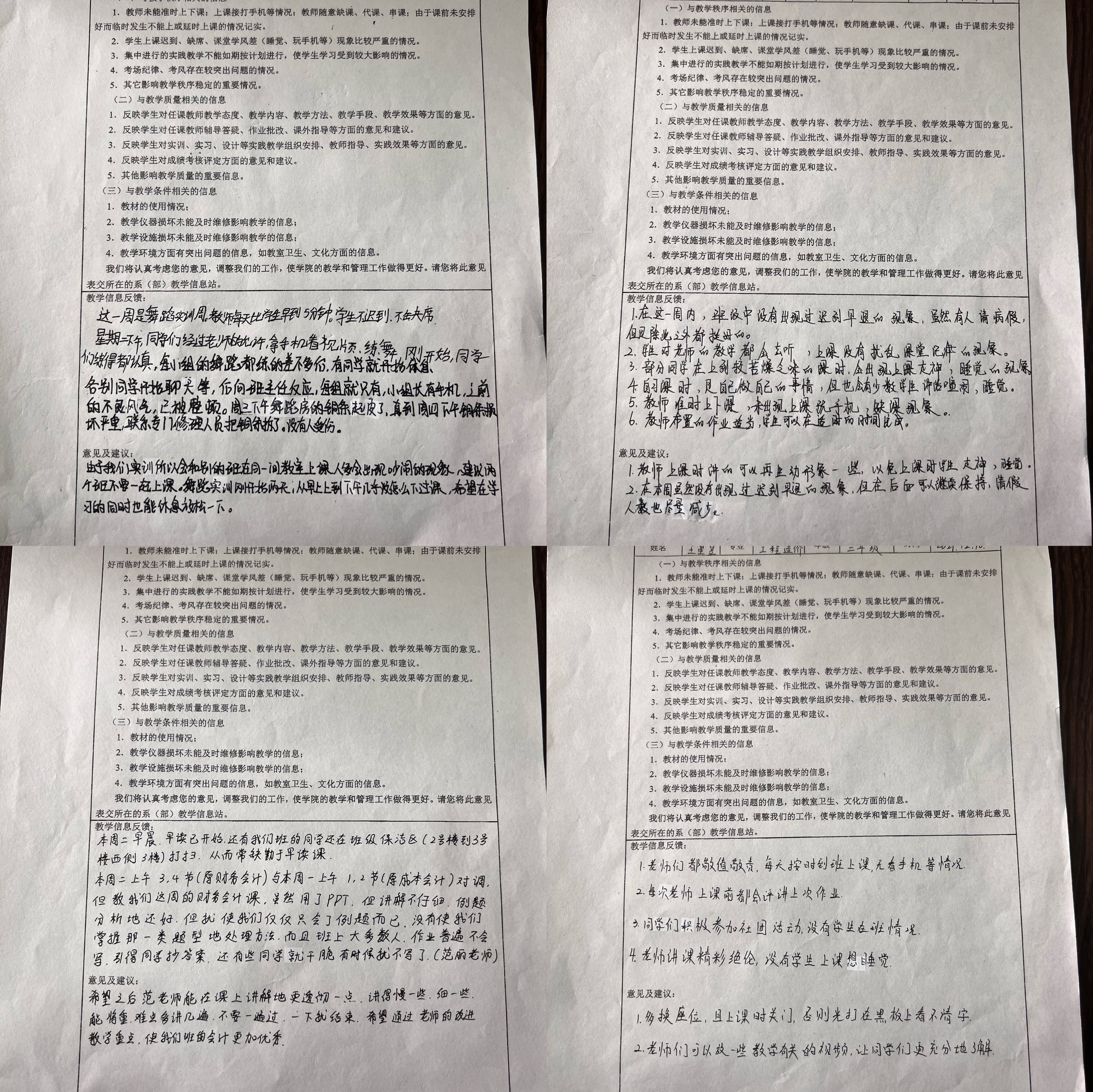 根据会议安排,教学信息员代表反馈有关教师的授课情况、学生的精神面貌、相关教学设施设备、社会热点和安全隐患等情况。学生信息员在会上畅所欲言,老师们认真倾听。之后,教学信息员认真填写了信息反馈表。通过此次会议密切了师生关系、增强了师生交流,是我校提高教学质量,促进教学管理,完善教学质量监控体系的重要手段。