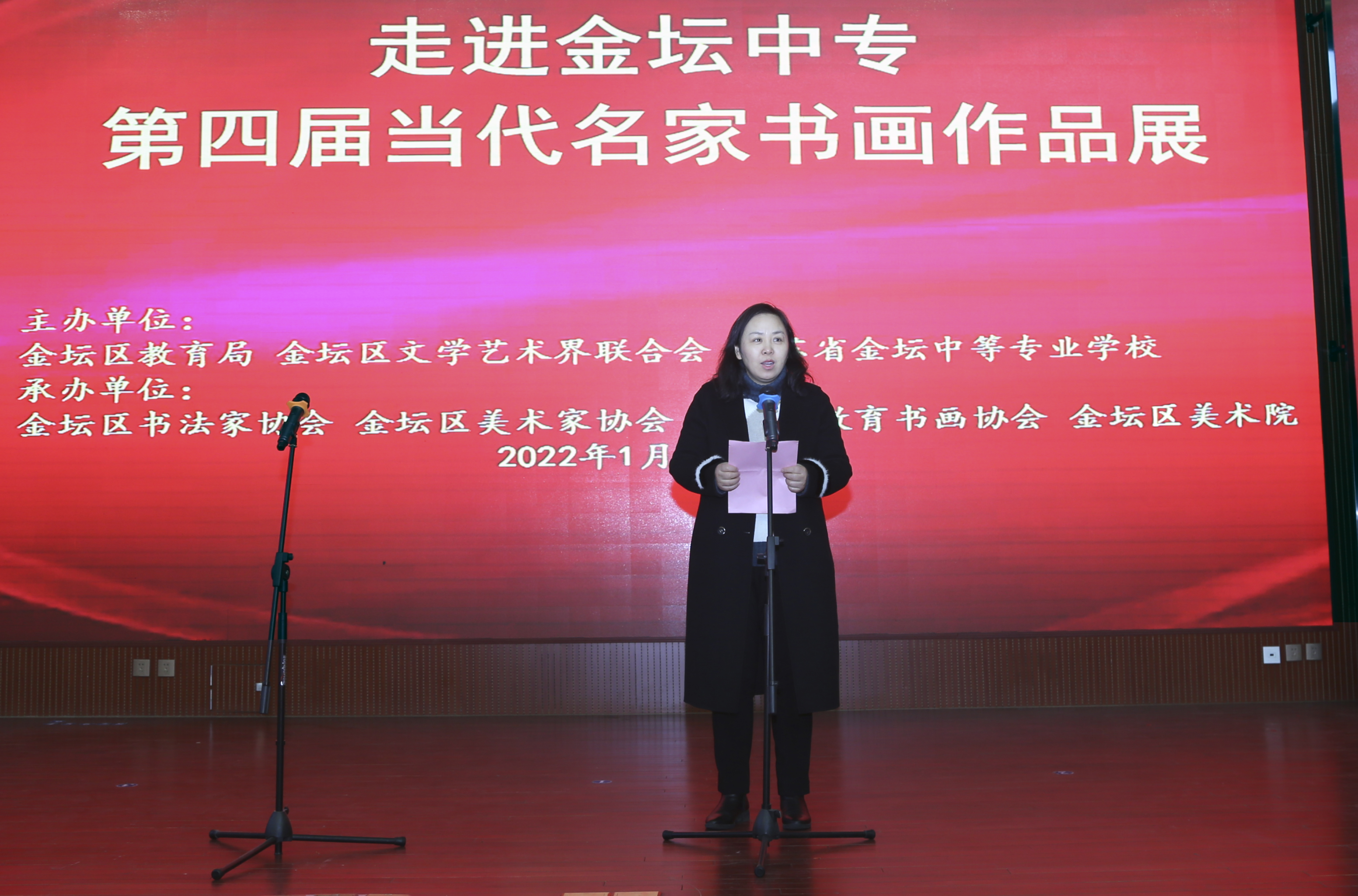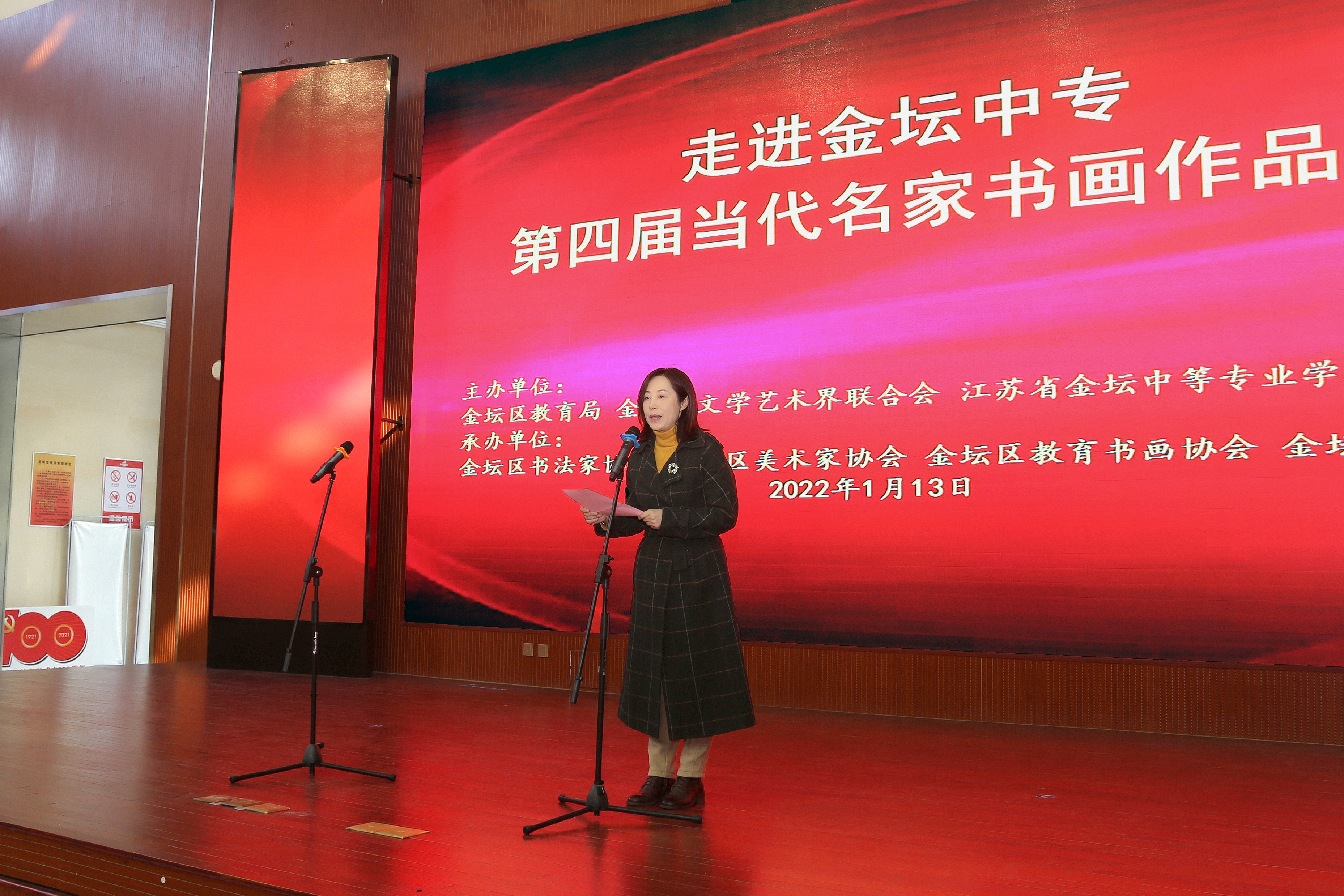 当代名家书画展由金坛中专主办,这充分说明了教育局领导和艺术协会对金坛中专的信任。金坛中专党总支书记林静书记是特邀发言人之一,为此,林书记首先向教育局领导和艺术协会表达了衷心的感谢;其次林书记向在场领导和嘉宾介绍了美育元素在金坛中专教育教学工作中的实施情况和演绎形式,得到了在场领导和嘉宾的充分肯定和一致好评。