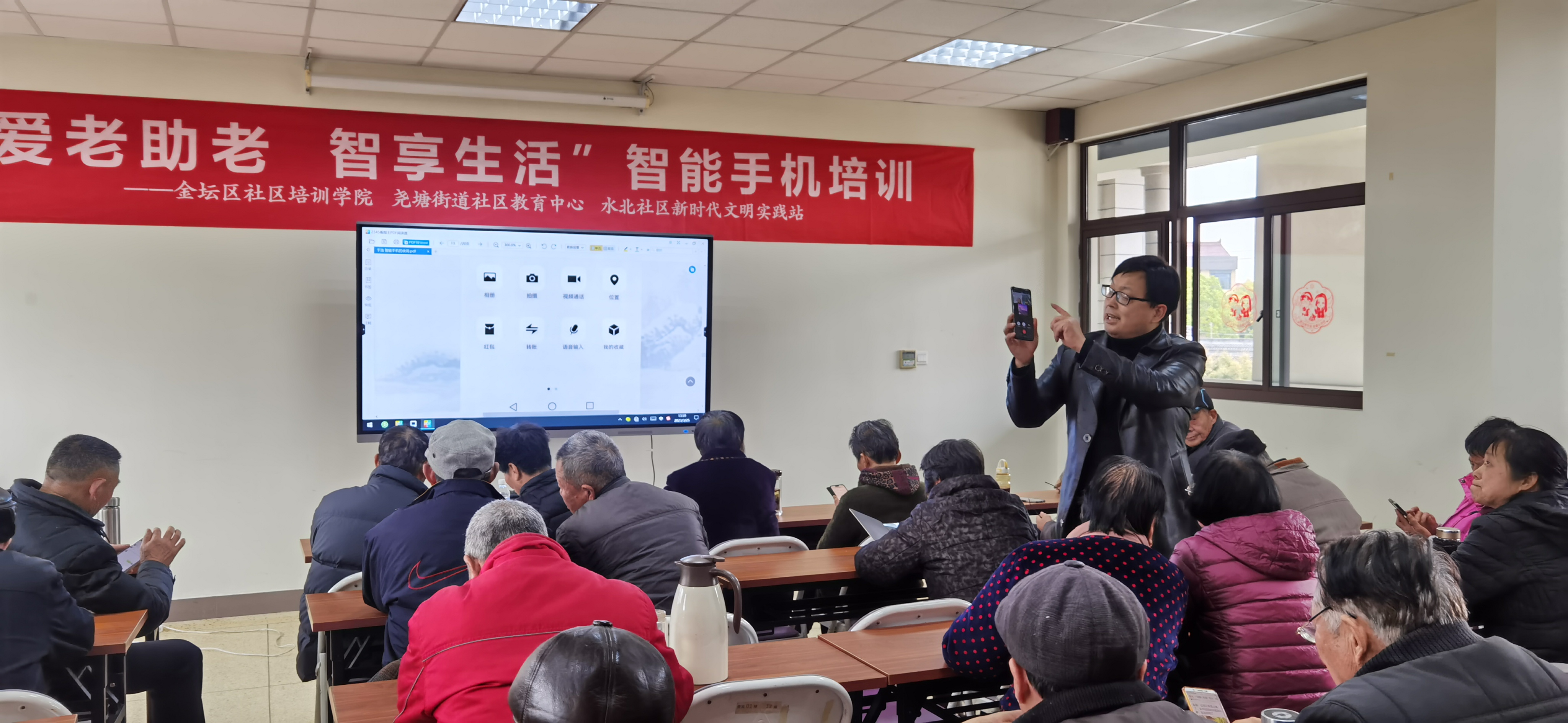 智能手机的普及让人们的生活更加便捷,也给一些老年朋友带来诸多不便。为提升老年人智能技术应用能力,丰富社区老年居民的业余生活,3月25日,金坛开放大学“老年人智能技术教育进社区”项目组走进水北社区,联合尧塘街道社区教育中心、沧海志愿服务中心,共同举办“爱老助老,智享生活”智能手机使用培训活动。