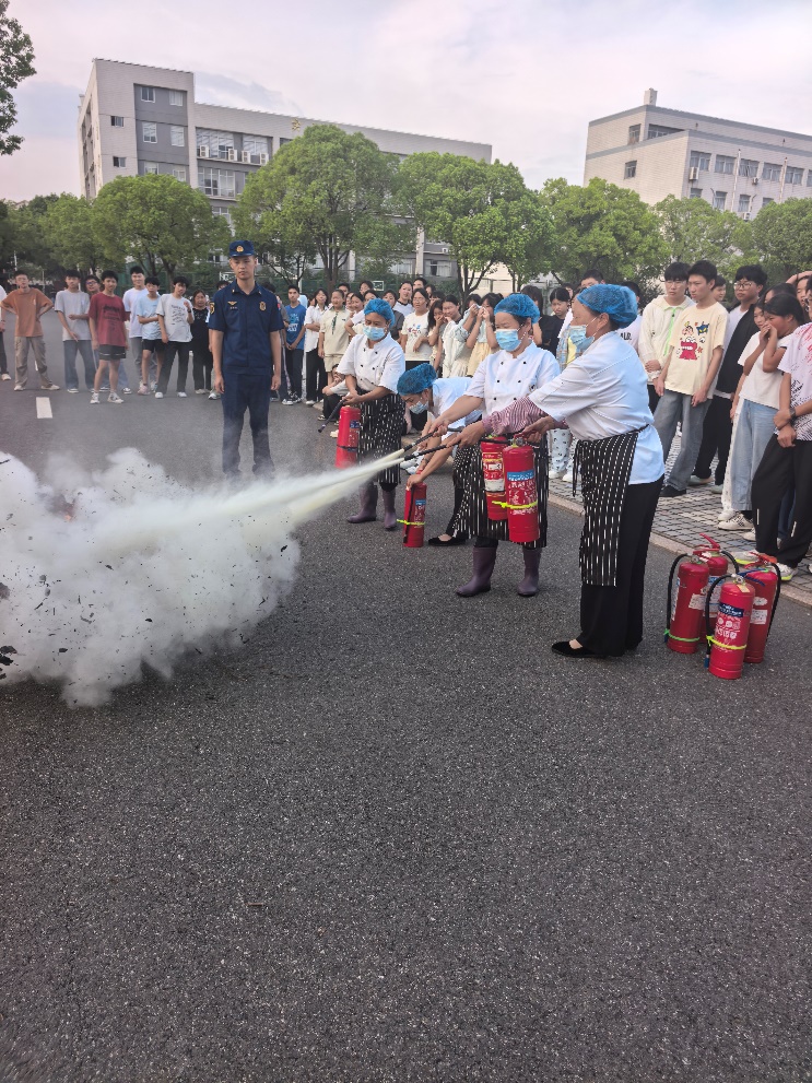 最后师生代表、后勤食堂员工、安保及宿管人员分组开展灭火实战演练。大家轮番使用灭火器扑灭模拟火源,在实践中巩固所学技能,提升协同配合与应急处置的整体能力。